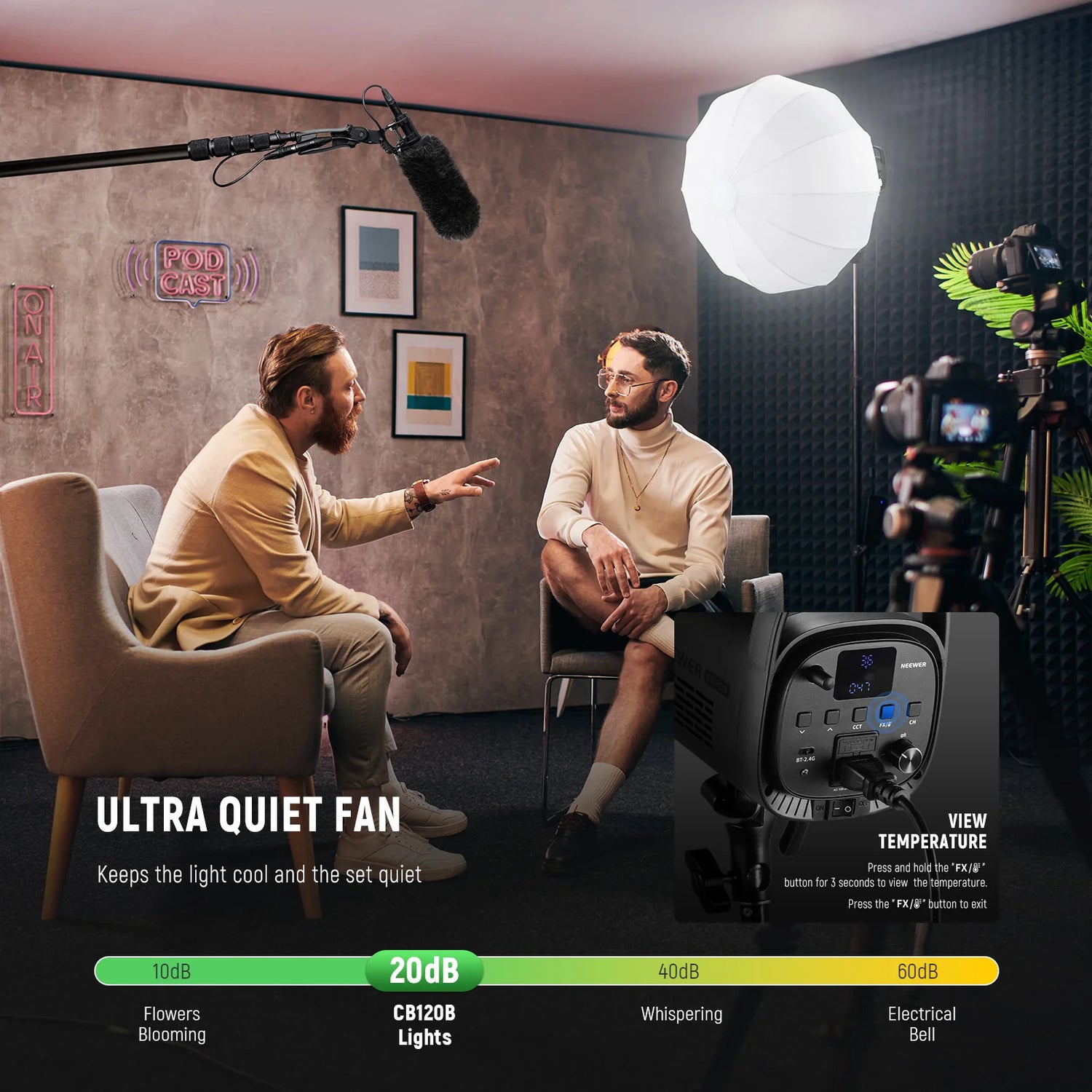 Neewer CB120B, peşəkar studiya fotoqrafiyası və yüksək keyfiyyətli video istehsalı üçün nəzərdə tutulmuş güclü 120W bicolor davamlı LED video işığıdır. 2700K-dan 6500K-a qədər tənzimlənən rəng temperaturu diapazonu sayəsində bu cihaz ətrafdakı işığı asanlıqla balanslaşdırmağa və ya xüsusi isti-soyuq atmosfer yaratmağa imkan verir. 97+ CRI və 98+ TLCI göstəriciləri ilə bu dolğu işığı, dəri tonlarının təbii və canlı görünməsini təmin edən mükəmməl rəng reproduksiya keyfiyyətinə malikdir. Daxil olan reflektorla 1 metr məsafədə 52,000 lüksa qədər yüksək parlaqlıq yaradaraq, geniş səhnələri kifayət qədər işıqlandırır. CB120B ultra-səssiz soyutma ventilyatoru ilə təchiz olunub ki, bu da səs yazılışı zamanı fon səsini minimuma endirir. İstifadəçilər parametrləri birbaşa cihaz üzərindəki interfeysdən və ya Bluetooth vasitəsilə Neewer tətbiqi ilə məsafədən idarə edə bilərlər. Yaradıcı kadrlar üçün ildırım və ya yanıb-sönən lampa kimi 12 daxili işıq effekti mövcuddur. İnteqrasiya olunmuş Bowens mount bağlantısı onu müxtəlif softbokslar və digər studiya aksesuarları ilə tam uyğun edir. Bu cihaz keyfiyyətli və universal işıqlandırma axtaran peşəkar videoqraflar və foto market alıcıları üçün mükəmməl foto avadanlıq seçimidir.