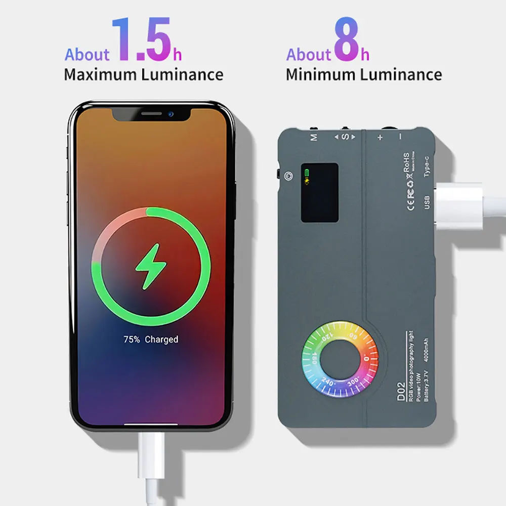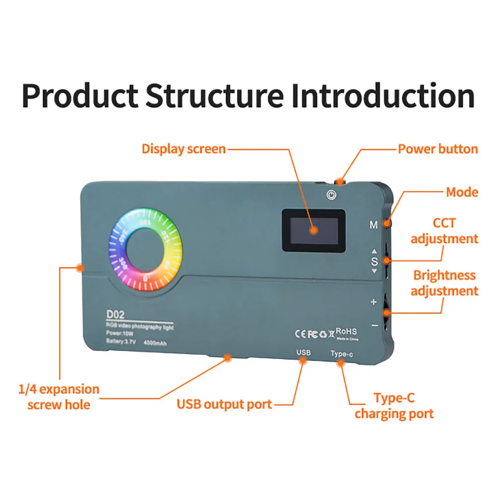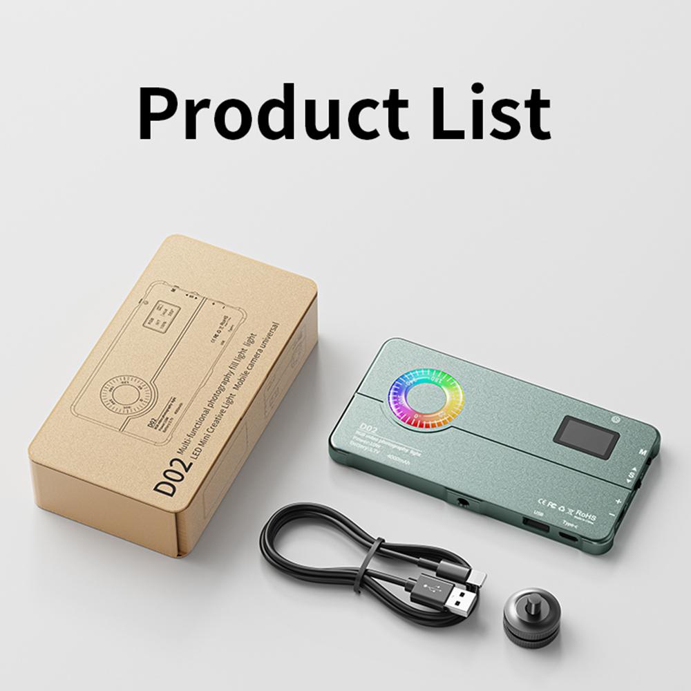 With a high Color Rendering Index (CRI) of 95+, this light guarantees exceptional color reproduction, meaning the colors captured in your photos and videos will be true-to-life and highly accurate. The robust built-in 4000mAh rechargeable battery offers approximately 90 minutes of continuous operation at maximum brightness, giving you reliable performance for long shooting sessions, and it conveniently recharges via a Type-C port. Adding to its versatility, the D02 features 24 built-in dynamic lighting effects—like SOS, fire, and TV simulation—which allow you to effortlessly create complex, cinematic scenes without extra equipment. Its compact design includes a standard 1/4-inch screw hole and a cold shoe adapter, making it easy to attach to cameras, tripods, gimbals, or light stands. Whether you are live streaming, shooting VLOGs, recording professional interviews, or engaging in small product photography, the D02 RGB light is the ultimate portable solution to elevate your lighting and video production quality. Invest in this powerful pocket light to ensure every shot is perfectly lit and every color is reproduced with professional precision.