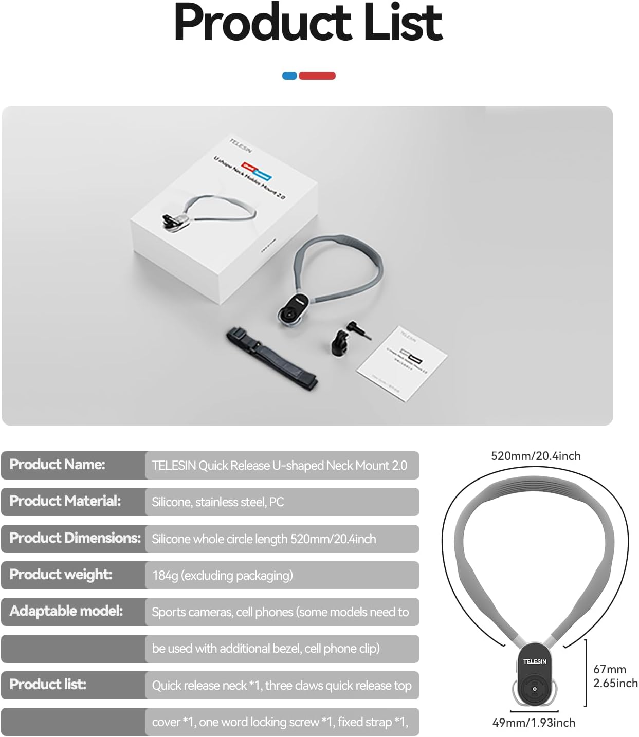 Daxili yüksək möhkəmlikli paslanmayan polad "qaz boynu" (gooseneck) ilə gücləndirilmiş bu pult 360 dərəcə fırlanma imkanı təmin edir. Bu o deməkdir ki, siz asanlıqla üfüqi (landşaft) və şaquli (portret) çəkiliş rejimləri arasında keçid edə bilərsiniz və ya pultu çıxarmadan mükəmməl çəkiliş üçün bucağı dəqiq tənzimləyə bilərsiniz. Pult, ayrı bir adapterdən (dəstə daxil deyil) istifadə etməklə smartfonlara da uyğunlaşmaq üçün nəzərdə tutulub, tətbiq sahəsini hərəkət kameralarından mobil kinematoqrafiyaya qədər genişləndirir. Yüngül və inanılmaz dərəcədə çoxfunksiyalı olan TELESIN Neck Mount 2.0, gündəlik təcrübələrinizi immersiv POV kontentinə çevirmək üçün lazım olan əvəzolunmaz əllər-sərbəst aksesuardır, hər dəfə stabil və etibarlı çəkilişi təmin edir. Onlayn sifariş vermək və ya almaq üçün əla studiyaavadanlığıdır.