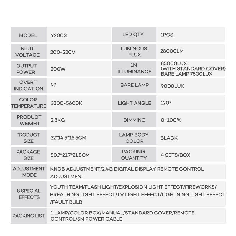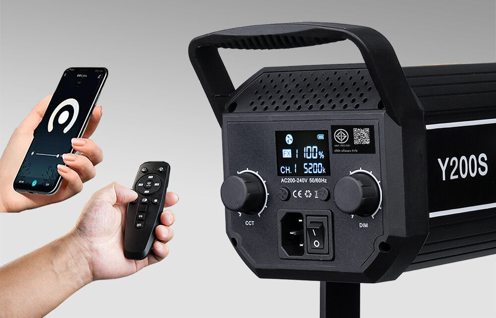 Y200S работает при входном напряжении 200-220V через входящий в комплект Сетевой Адаптер. Управление осуществляется с помощью четкого заднего ЖК-дисплея и специальных ручек регулировки. Для современного удаленного управления свет поддерживает как беспроводное управление 2.4G, так и Управление через мобильное приложение Bluetooth (Bluetooth APP Control).